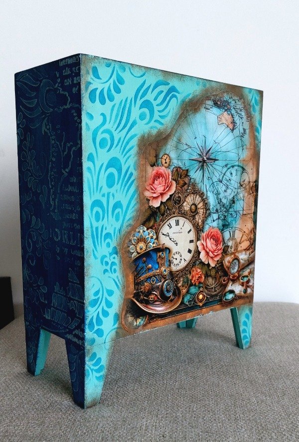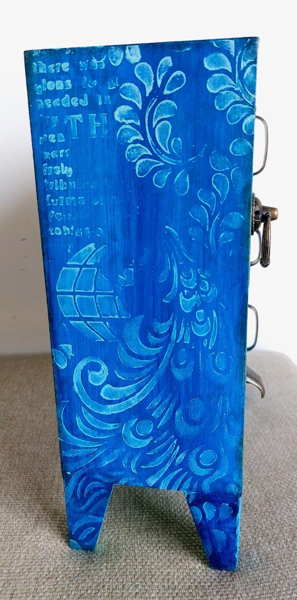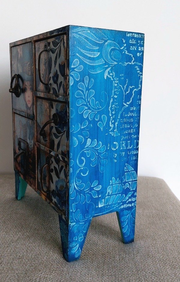 Hermosa cajonera con herrajes de metal, realizada en mdf e intervenida enteramente a mano. Posee 5 cajones y 4 patas. Colores elegidos azules, aquas y celestes. Ideal para regalar , se puede utilizar como caja de te , alajero , o para lo que gusten. Medidas: 26,5 con patas incluidas 10 cm de profundidad y 22 de ancho.