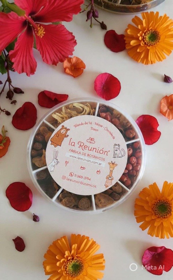 Mix de botanicos La Reunion , que contienen blends para tragos . Estos toppings incluyen , petalos de rosa, pimienta rosa, hibiscus, anis estrellado,canela,enebro,calendula y pimienta de jamaica.